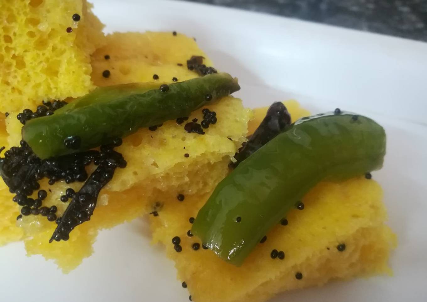 - Remove the plate and cool it for 5 minutes. Now heat 50 gms oil in a pan add mustard seeds, green chillies, meetha neem allow it to spatter. Pour a cup of water in it. After boiling add lemon and sugar. Now cut the khaman into equal pieces. Now sprinkle that ready chounk on khaman.
