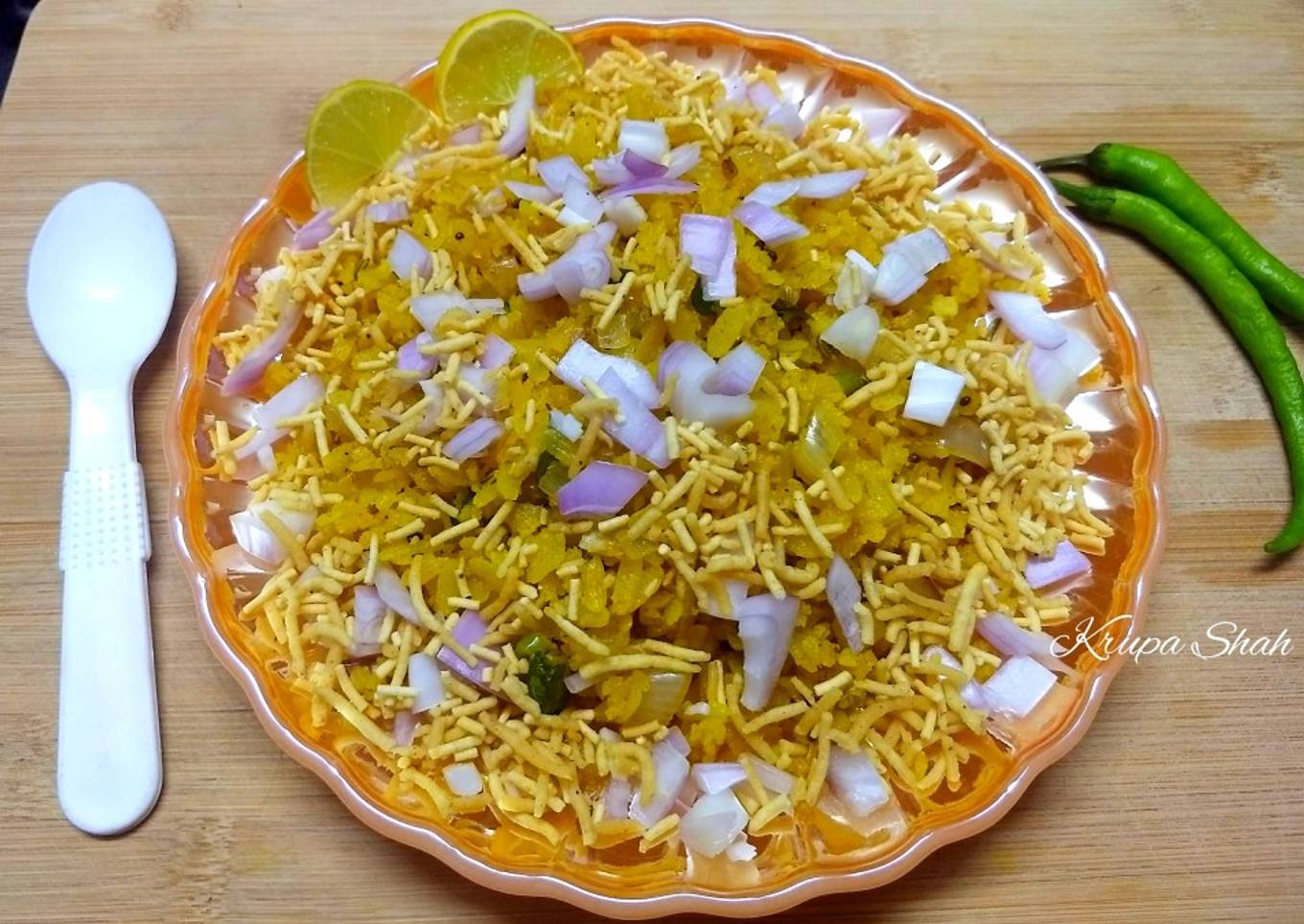 - While serving, top the ready Indori Poha with chopped onions (1/4 part) and Bikaneri sev. We can add pomegranates and spicy boondi to it.