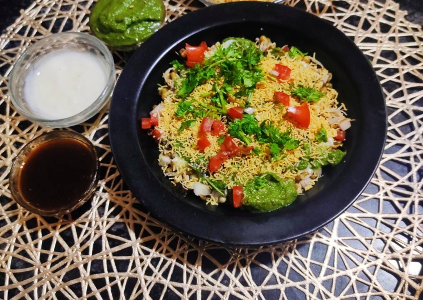 - Then pour some whisked curd, sweet tamarind chutney, and green chutney.