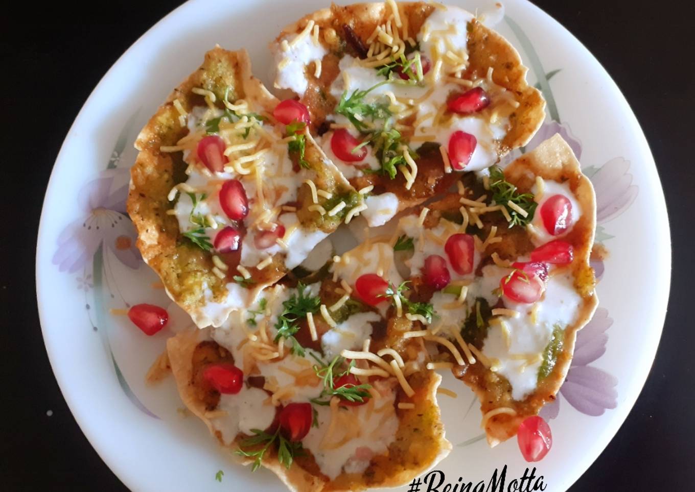 #Zing My innovative, experimental recipe. You may have enjoyed moong dal pakoras and Papad chat delicacy. Here I made fusion of both. Green moong dal pakoras batter is spread on urad papad pieces,deep fry in oil. Made yummy chat by pouring dahi / curd, sweet and spicy chutneys, topped with pomegranate,sev& coriander leaves fried papad-moong dal chips .