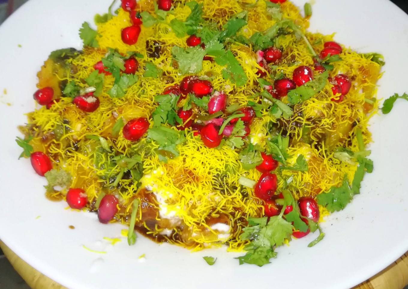 - Top with pomegranate seeds and coriander leaves.some green chutney and meeti chutney.